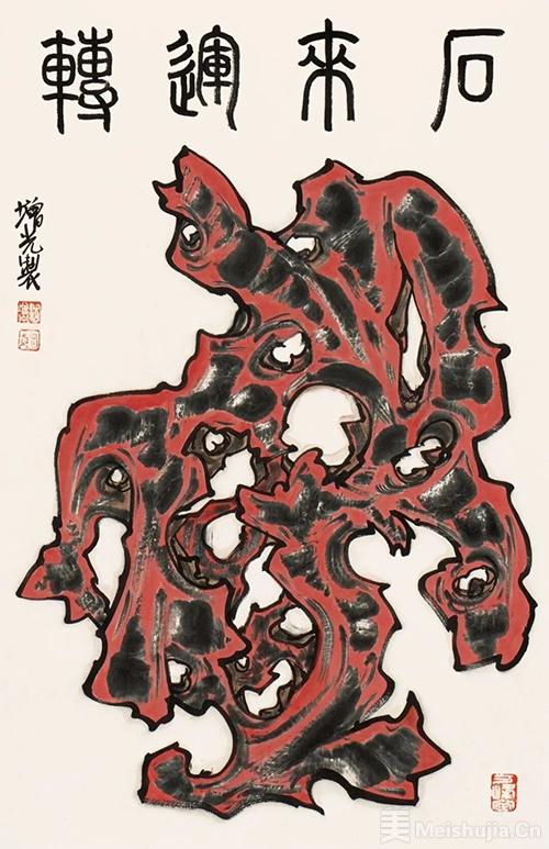 此次展出的赏石作品,是岳增光艺术探索的一次全新突破——他将青绿山水的创作技法与赏石题材完美融合,让笔墨的韵律与奇石的肌理相互交织,形成了独树一帜的艺术表达。在他的笔下,赏石不再是简单的自然物象复刻,而是承载着情感与寓意的艺术载体。其中,青绿色的赏石作品,延续了他青绿山水的经典色调,石身晕染的青黛与翠绿,似远山含黛、近水凝烟,将太湖石的清润之气与山水的空灵之境融为一体,观之令人心静神宁;红色的赏石则洋溢着热烈奔放的生命力,朱砂般的色彩浓艳而不失雅致,笔触遒劲有力,既凸显了奇石的嶙峋之态,又暗合“红运当头”的美好寓意,传递出积极向上的生活期许;紫色的赏石作品则更显典雅深邃,淡紫、深紫层层晕染,辅以留白与墨线勾勒,石形苍劲而不失灵动,恰应“紫气东来”的传统吉兆,蕴含着祥瑞安康的美好祝愿。