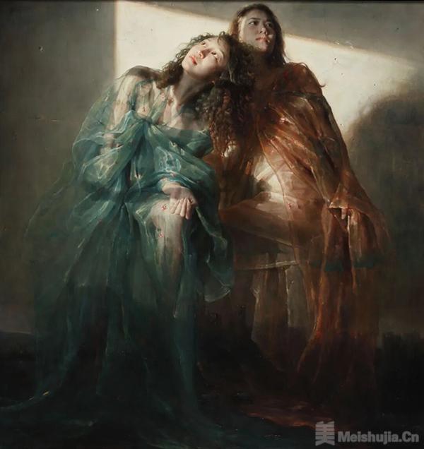 在早些时候,他是丝绸与光影的诗人。那些精微绝伦的“丝绸系列”,宛如一曲曲视觉的咏叹调。画中的女性与丝绸低语,光影在缎面上流淌——丝绸在他笔下,升华为中华物质文明的温润结晶;女性形象,成为“上善若水”哲学的诗意化身;而斑驳的光影,则是生命丰繁层次的隐喻。
