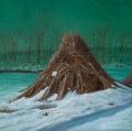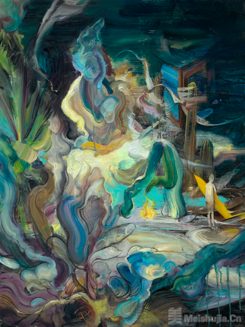 这一“造景”路径,源自他早期从事游戏原画工作的经历。他常用三维建模方式去搭建虚拟空间,再将其转译为油画语言,三维模型中特有的视角控制、层级设定与场景构成,为他的绘画赋予了有别于传统写生或平面构成的观看视角,令画面呈现出类似游戏关卡的场景特质。他将自然形态夸张、异化处理,最终形成色彩饱和且秩序清晰的“虚拟乐园”,观者被以“冒险者”的身份邀请入画面,在其间游走、驻足。绘画由此成为“虚拟造景”的媒介,在数字技术与手工痕迹的交融中,折射个体情感的隐喻图景。