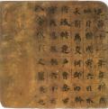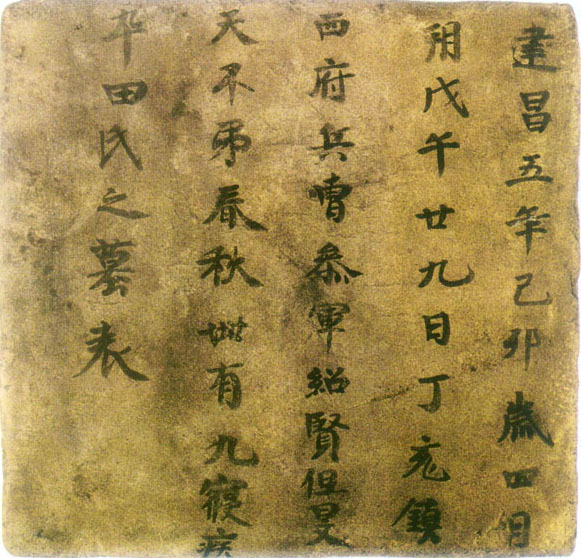 《赵荣宗妻韩氏墓表》砖,墨笔,纵35×横35×厚3.7厘米。北京故宫博物院藏。高昌建昌元年(555年),墨书六行四十五字。