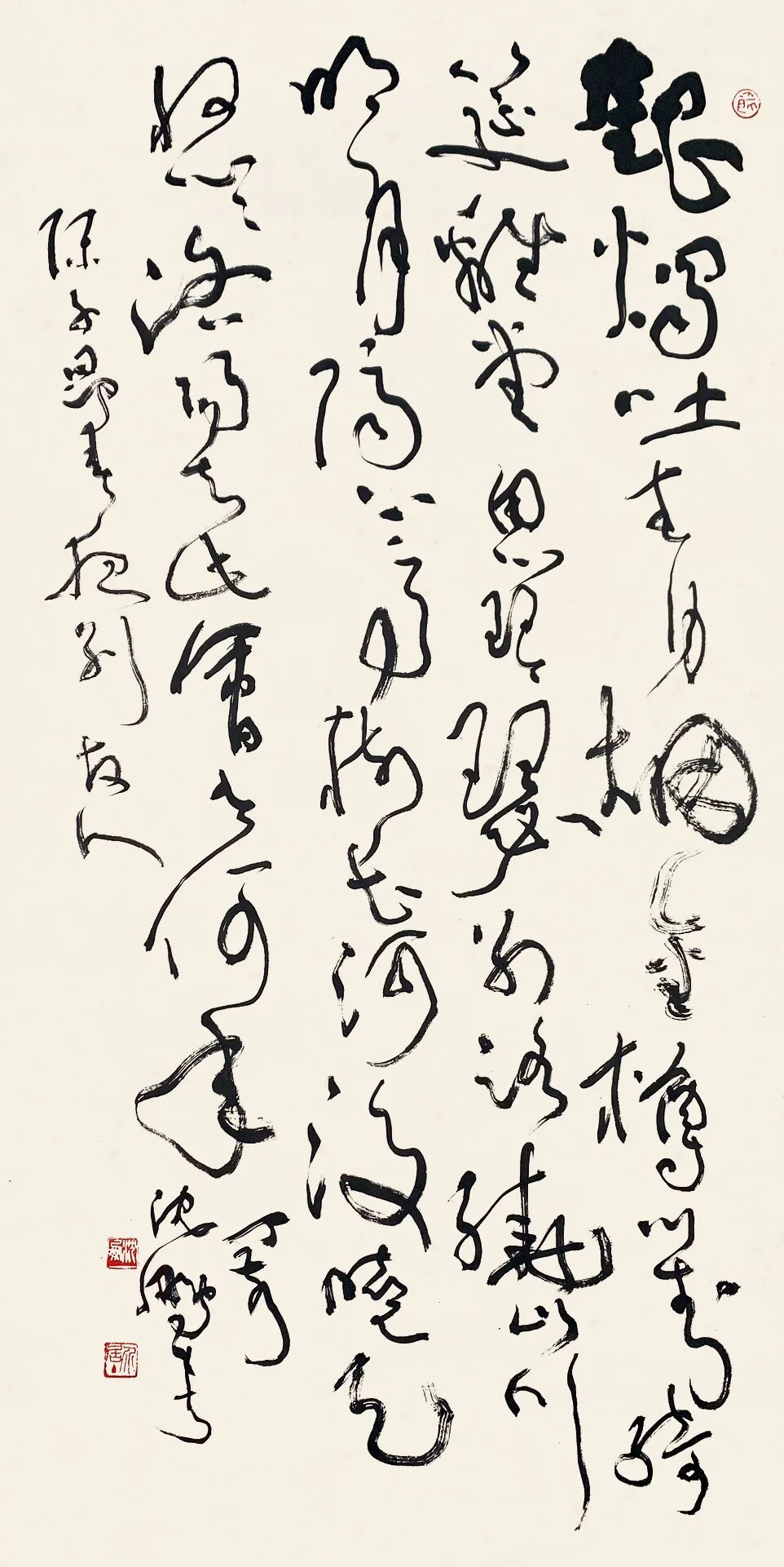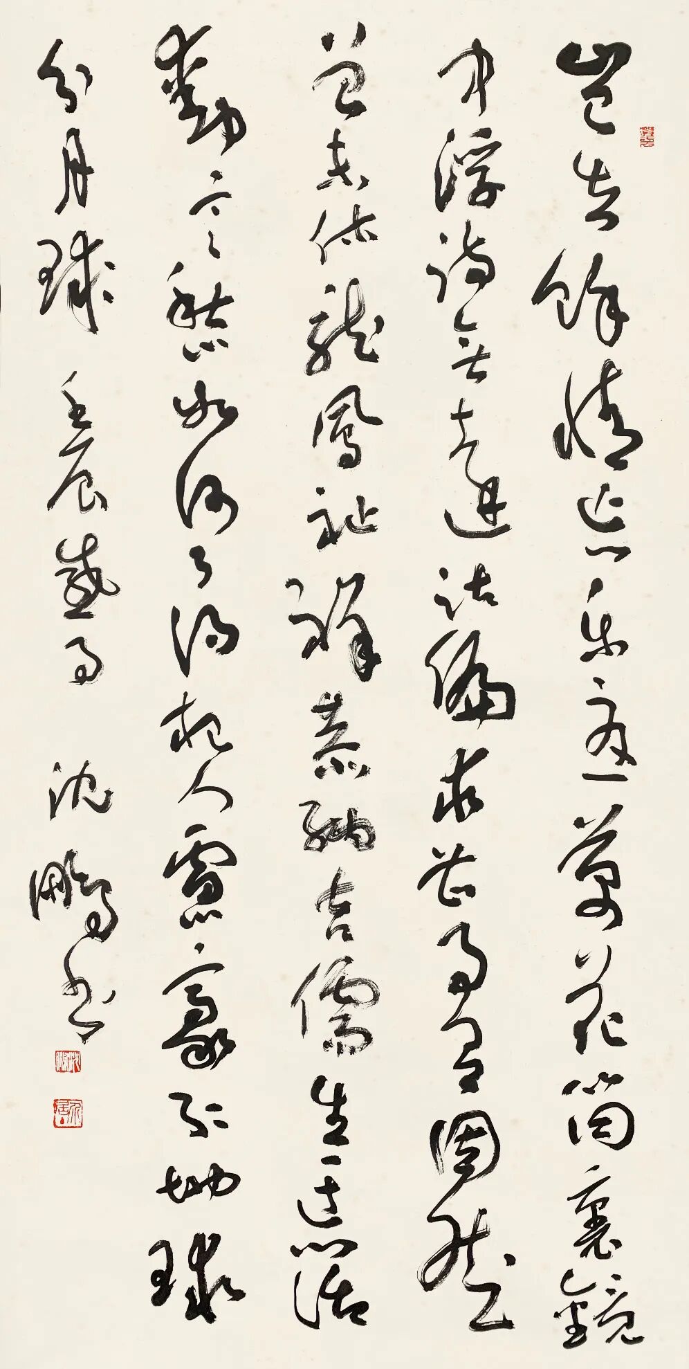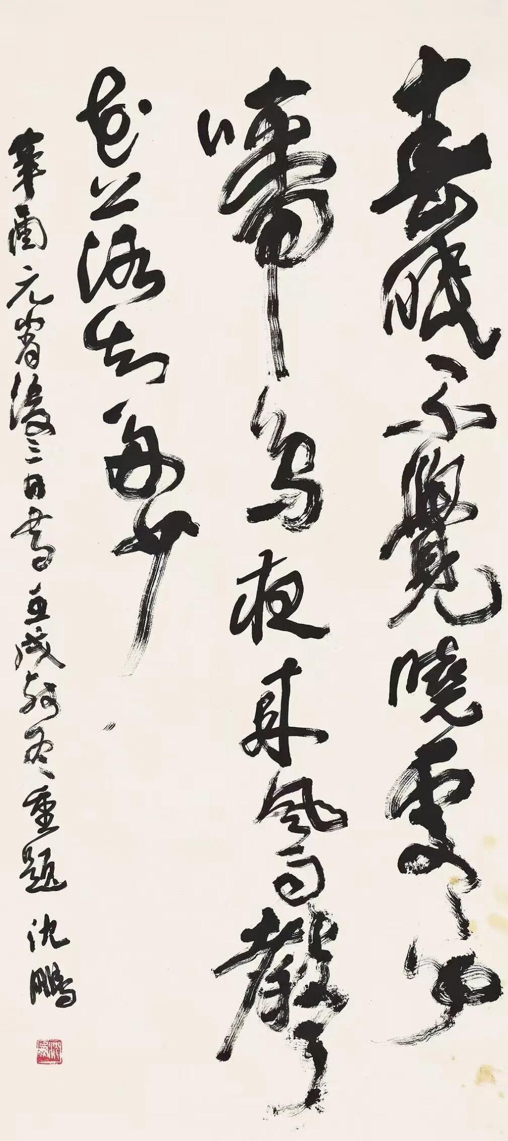 沈鹏的草书以“碑帖融合”为核心特征,其笔法既承续汉魏碑刻的朴拙雄强,又融入晋唐行草的飘逸灵动。以中锋为主,力透纸背,线条如“老藤盘绕”,兼具张力与韧性。单字常作欹侧险绝之态,通过字组间的疏密、俯仰形成动态平衡。通篇如“乱石铺街”,看似无序却以“气”贯穿始终。