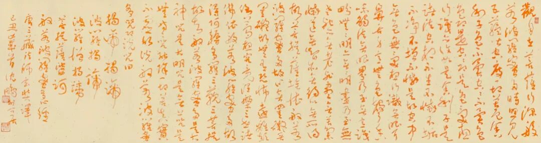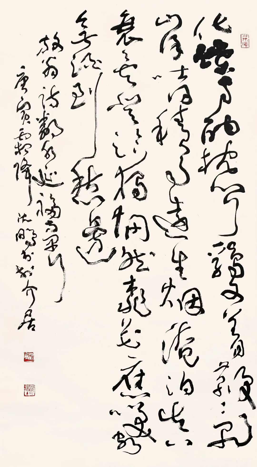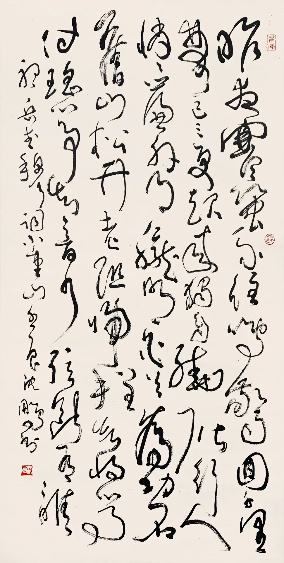 沈鹏的草书以“碑帖融合”为核心特征,其笔法既承续汉魏碑刻的朴拙雄强,又融入晋唐行草的飘逸灵动。以中锋为主,力透纸背,线条如“老藤盘绕”,兼具张力与韧性。单字常作欹侧险绝之态,通过字组间的疏密、俯仰形成动态平衡。通篇如“乱石铺街”,看似无序却以“气”贯穿始终。