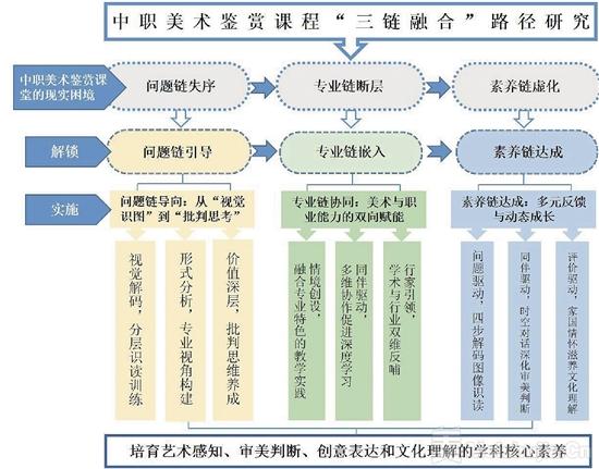 “三链融合”教学路径以问题链驱动学习、以专业链衔接能力、以素养链引领发展,为中职学校美术鉴赏课程提供了系统性解决方案。使美术学科教学中不仅有了明确的教学目标,而且能联系学生专业,将新课程标准中核心素养的育人目标落实到位。帮助教师在清晰的教学目标框架下系统把握教学流程,促进学习目标的达成,进而实现学科核心素养的培育,助力学生综合能力的发展。未来需进一步探索不同专业的适配模式,推动美术教育与职业教育的深度融合,实现以美育人、以文化人的教育目标。