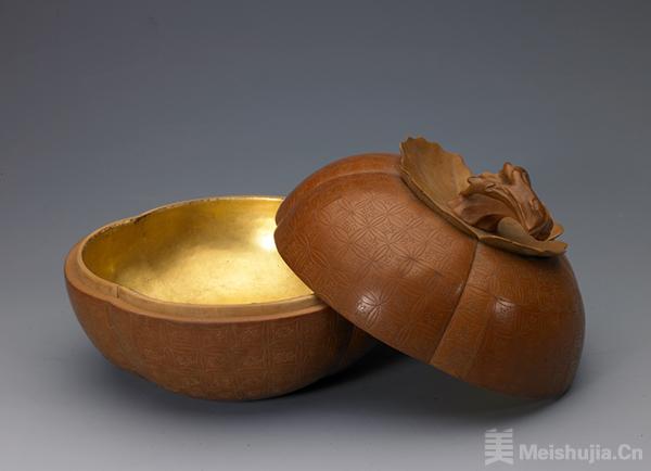 文竹金漆里柿子式盒以黄杨木制成,其木质柔韧细密、色泽淡黄无疵。整器雕刻成柿子的形状,通体镶嵌竹黄。柿盒从中部可以一分为二,盖子和盒身通过子母口扣合,内壁涂有金漆。盖钮部分雕刻成柿蒂状,色泽和质地与竹黄相得益彰。柿蒂逼真,观之喜人。清朝中期颇为流行的文竹仿生器具是实用性与观赏性兼具的陈设品,一般被放置在几案与格架之上,以装点生活。这件柿形盒既展现了文竹仿生器具匠人的巧思与技艺,更体现了当时生活的精致与品位。