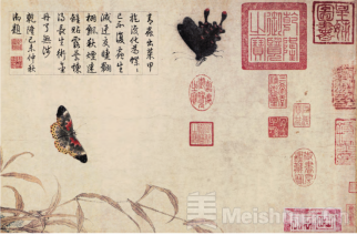 在物象排布上,赵昌遵循“自然错落”的原则,摒弃对称、均衡的人工化构图逻辑:杂草的分布看似杂乱无章,实则暗含疏密节奏,左侧野草野花密集生长,右侧相对疏朗,形成“左密右疏”的视觉平衡;三只蛱蝶的位置构成“三角张力”——飞舞的三只蛱蝶为“动点”,下方的植物为“静点”,静者锚定画面重心,动者牵引视线流动,使疏朗的画面不至于松散;左侧隐藏的蚱蜢作为“暗点”,与蛱蝶形成呼应,让画面在“显与隐”的对比中更显层次。这种“不事雕琢、顺其自然”的构图方式,恰是“野逸”美学“摆脱桎梏、回归本真”的视觉呈现,与宫廷花鸟画的“繁复堆砌、刻意对称”形成鲜明反差。
