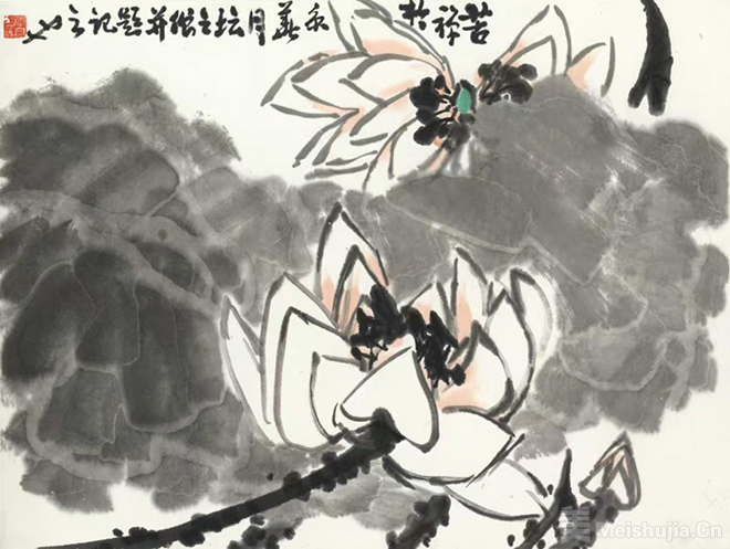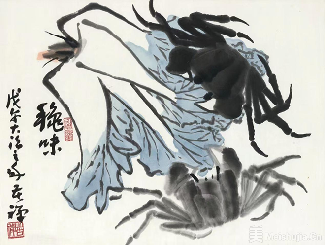 齐派弟子中,李可染主攻山水画,王雪涛开创小写意花鸟画,崔子范发展了“不似之似”与“浓墨重彩”,郭味蕖聚焦果蔬题材,且主题性更强。在写意精神、笔墨传统和题材定位上,真正与齐白石神韵相通的还是李苦禅。李苦禅从事教学工作,其大写意花鸟画在造型上更加严谨和收敛,融入了不少写生元素,尤其是在水墨渲染方面,其用墨的层次、墨线的节奏感与层次性更见功夫,既大刀阔斧又笔精墨妙,如《美人面牡丹》。