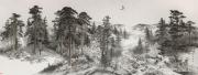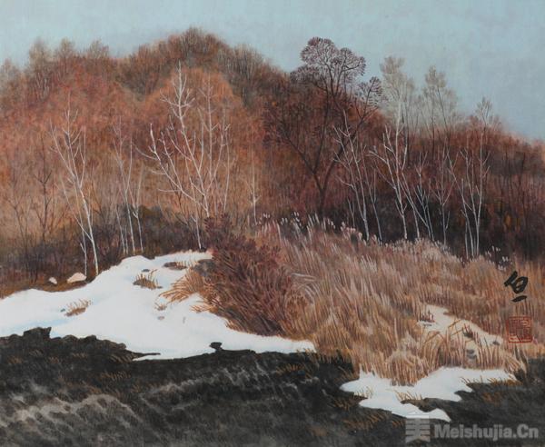 其山水画的核心魅力,在于对东北平原“大、平、广、远、荒、寒”六大美学特质的精准诠释。不同于传统山水的崇山峻岭、奇峰怪石,徐白一将目光投向松辽平原的雪原旷野、长白山脉的苍莽林海,以散点透视与焦点透视的融合运用,打破传统山水的空间局限。近景是皑皑雪原与平缓丘陵,素净苍茫;中景是错综交织的林木灌木,枝丫的形态、树皮的肌理、叶片的脉络皆刻画入微,着墨最丰;远景是辽阔天际与层叠山峦,虚实相生,将传统“三远法”的高远、深远、平远演绎得淋漓尽致,营造出纵深感、高峻感与宽阔感兼具的视觉体验。