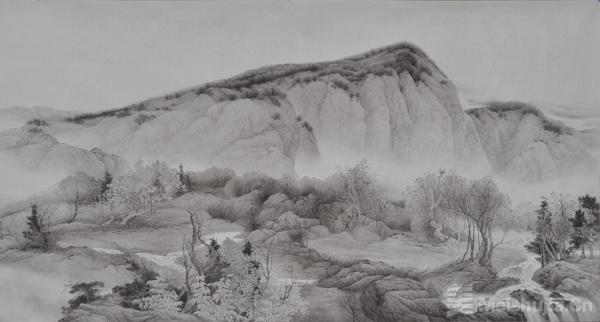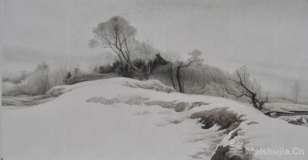 冰雪题材是徐白一艺术创作的标志性符号,也是其对北方美学的极致表达。他笔下的冰雪,无凛冽萧瑟之态,却有清寂温润之韵,白雪覆盖的原野、冰封的河流、覆雪的林木,在细腻的笔墨晕染中,呈现出“大荒含真情,白雪蓄暖意”的意境。这种对冰雪的独特诠释,源于他对故土的深情眷恋,更源于其“以具象绘抽象”的艺术追求——以写实的自然物象为载体,传递出超越物质的精神境界,让观者在静谧的画面中,感受到天地辽阔、人心澄澈的哲思。