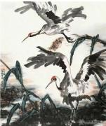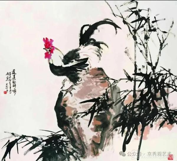 早年,他深耕乡土,以雄鸡为创作核心。家乡院落里的鸡鸣司晨,滋养着他最初的艺术感知。他注重从民族文化、古典名著与民间传说中汲取养分,将鸡的“文、武、勇、仁、信、义”六德融入笔墨,让雄鸡成为美好社会与信义乡土的人格化身。《故乡之恋》《希望的田野》笔力雄健;《一声啼鸣散天星》气象开张;《春水悠悠故乡来》则尽显运河水乡温润灵动。他以大笔触写风骨,以细笔墨写生趣,形成“大处见气势,小处见精神”的独特境界。